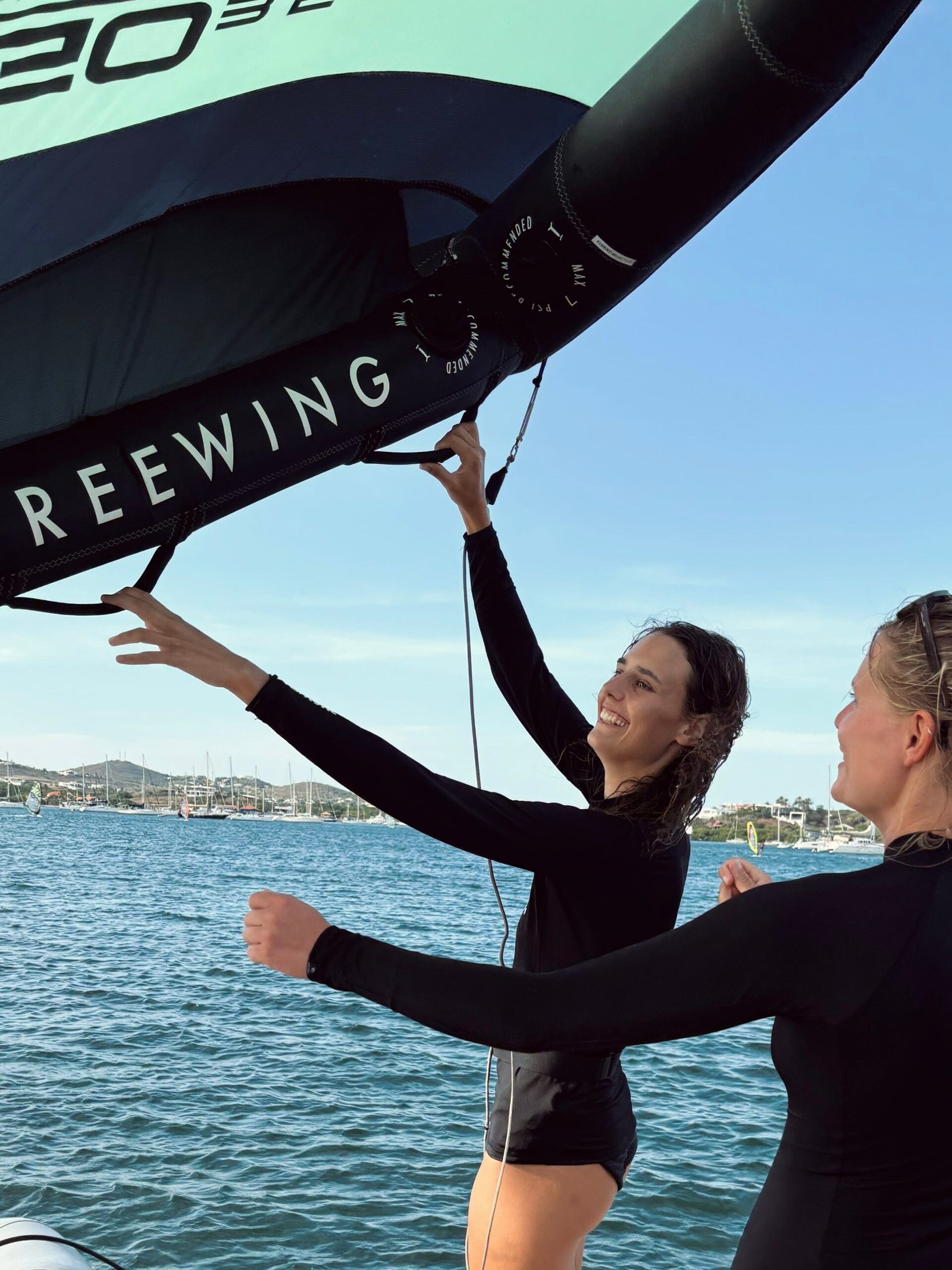 ‘Als klein meisje raakte ik al verslaafd aan water en wind en leerden mijn ouders me zeilen. Tijdens mijn studententijd ontdekte ik het kitesurfen en ook daar was ik meteen hooked. Omdat ik altijd al graag anderen iets leer, duurde het niet lang voordat ik mijn IKO-instructeursopleiding volgde om kitesurfles te gaan geven. Voor mijn studie geneeskunde mocht ik een jaar naar Curaçao, waar mijn watersportverslaving alleen maar groter werd. Ik leerde er windsurfen en wingfoilen en toen ze instructeurs tekortkwamen, kreeg ik de kans om ook wingfoil-instructeur te worden. Nu ik terug ben in Groningen, wil ik dit graag hier voortzetten. Hoe meer mensen het water op gaan, hoe leuker!’